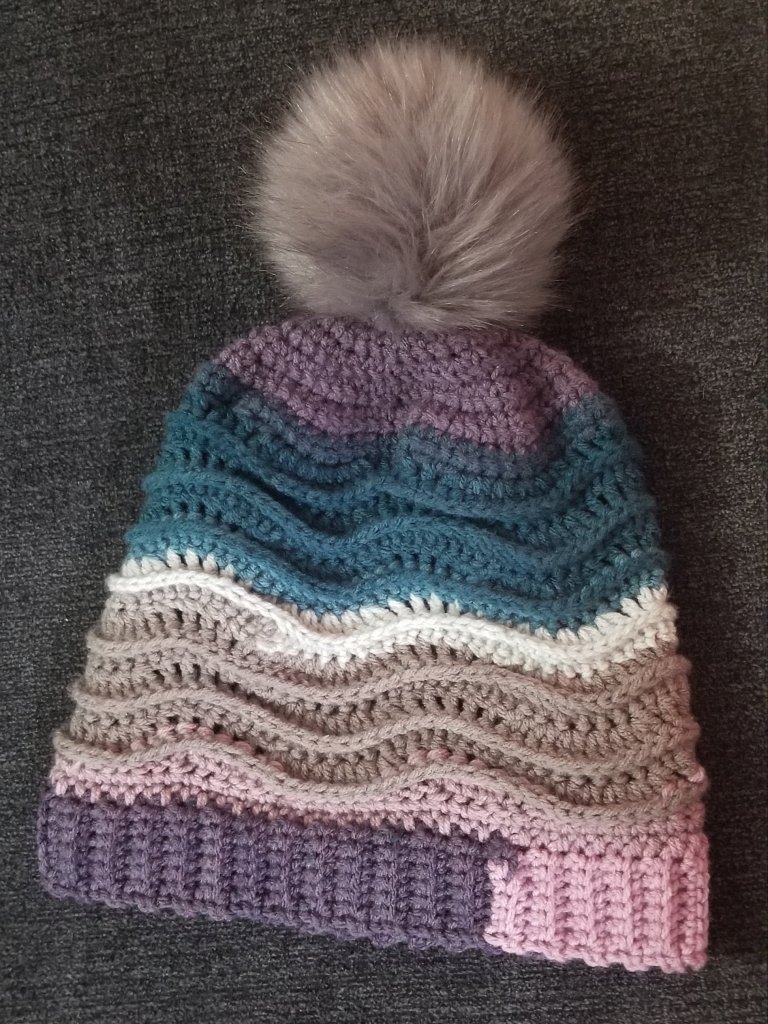 I crocheted myself this slouchy beanie with a big pom pom. This is one of my favorite wave stitch that is usually crocheted flat. I hate seaming up the edges together, so I created a pattern and turned this stitch into a circular form. I still need to finish writing the pattern, though.