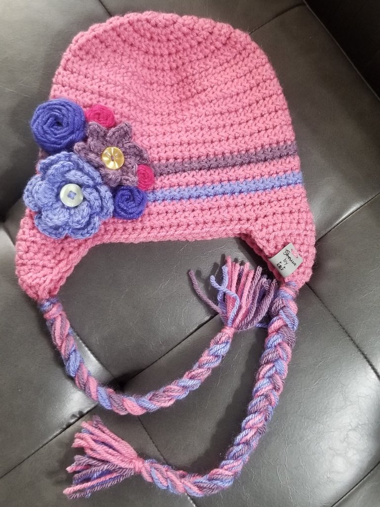 I was commissioned by someone to crochet a toddler hat for her great-niece. She just wanted something pink with flowers and earflaps with braids. So this was what I came up with. I crocheted two different flowers and added 4 embroidered rosettes.