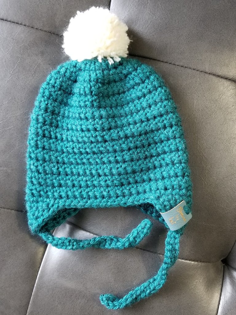 I crocheted this baby hat for my future baby. This is one of my favorite colors, teal, and I decided to top it off with a creamy white pom pom.